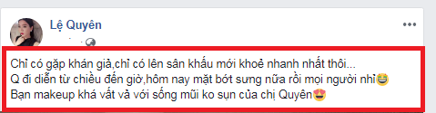 Mới đây trên trang cá nhân của mình ca sĩ Lệ Quyên thông báo tình hình sức khỏe của cô với chiếc mũi đã được tháo sụn giả, gương mặt bớt sưng khiến fan "thở phào". Đi kèm với bức ảnh này, Lệ Quyên viết: "Chỉ có gặp khán giả, chỉ có lên sân khấu mới khoẻ nhanh nhất thôi...Quyên đi diễn từ chiều đến giờ, hôm nay mặt bớt sưng nữa rồi mọi người nhỉ! Bạn make up khá vất vả với sống mũi không sụn của chị Quyên".