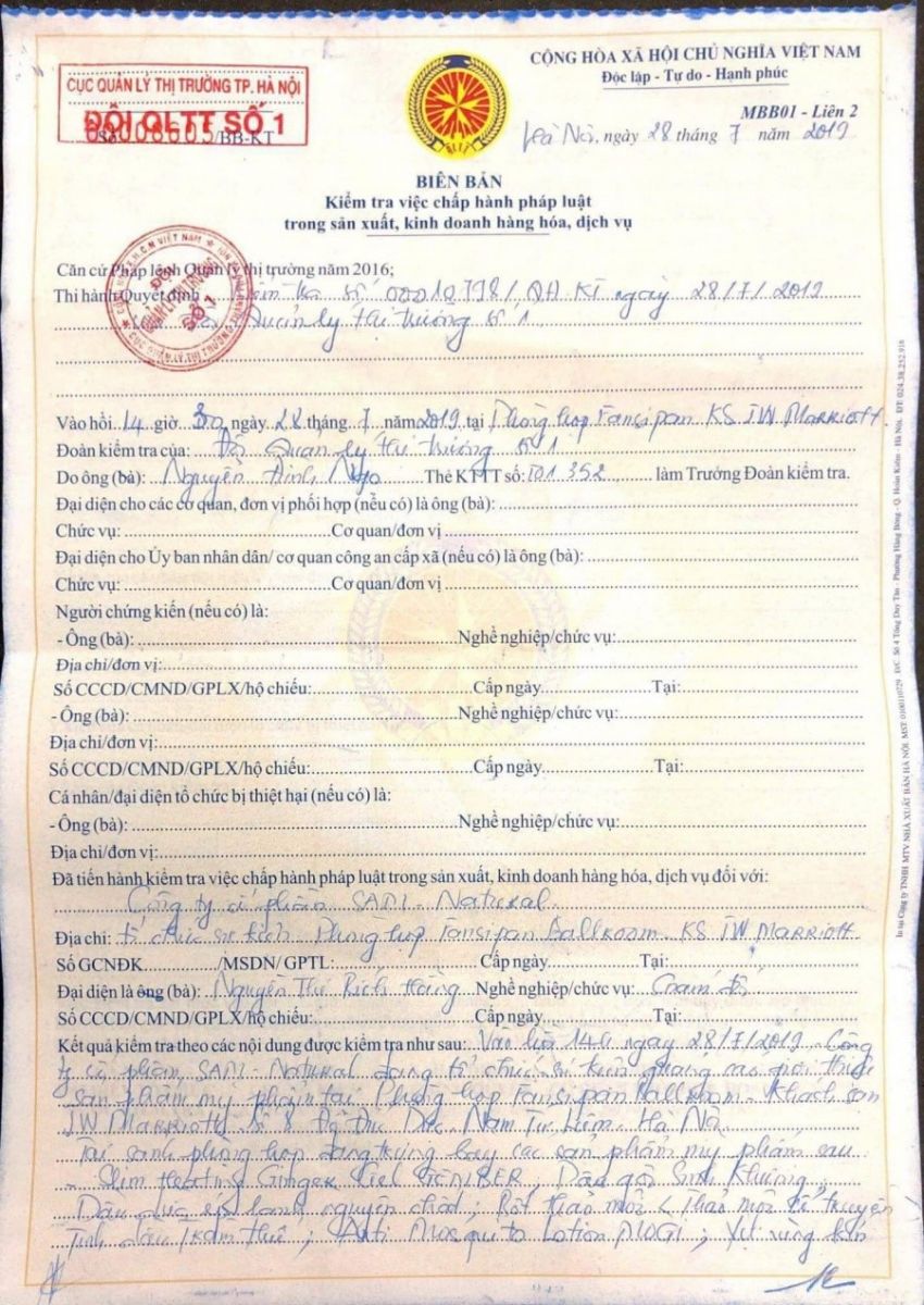Trong biên bản kiểm tra ghi rõ, vào ngày 28/7/2019, Công ty Cổ phần Sam Natural tổ chức sự kiện quảng cáo giới thiệu sản phẩm mỹ phẩm tại phòng họp Fansipan Ball room. Tại sảnh phòng họp đang trưng bày các sản phẩm mỹ phẩm sau: Dầu gội Sinh Khương, dầu dừa ép lạnh nguyên chất, dầu gừng, bột thảo mộc, tinh dầu tràm Huế, Xịt vùng kín...