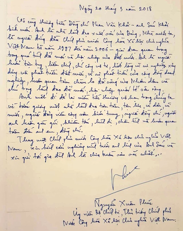 Thủ tướng Nguyễn Xuân Phúc ghi sổ tang: “Vô cùng thương tiếc đồng chí Phan Văn Khải - Anh Sáu Khải kính mến. Anh là nhà lãnh đạo xuất sắc của Đảng, Nhà nước ta, là người đứng đầu Chính phủ nước Cộng hòa xã hội chủ nghĩa Việt Nam từ năm 1997-2006 - giai đoạn quan trọng trong quá trình đổi mới và hội nhập của đất nước.