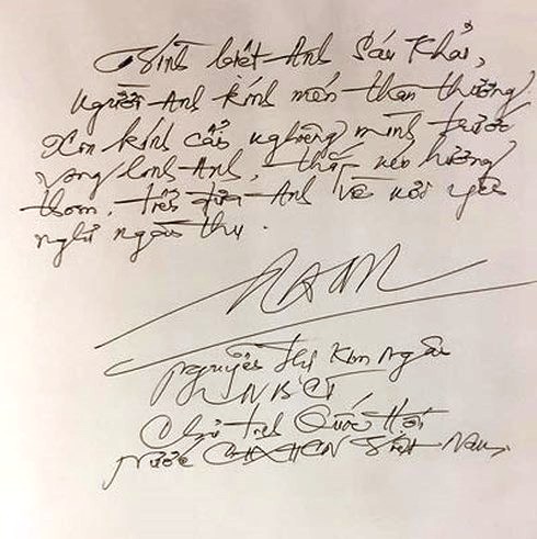 Ghi sổ tang, Chủ tịch Quốc hội Nguyễn Thị Kim Ngân viết: "Vĩnh biệt anh Sáu Khải, người anh quý mến thân thương.