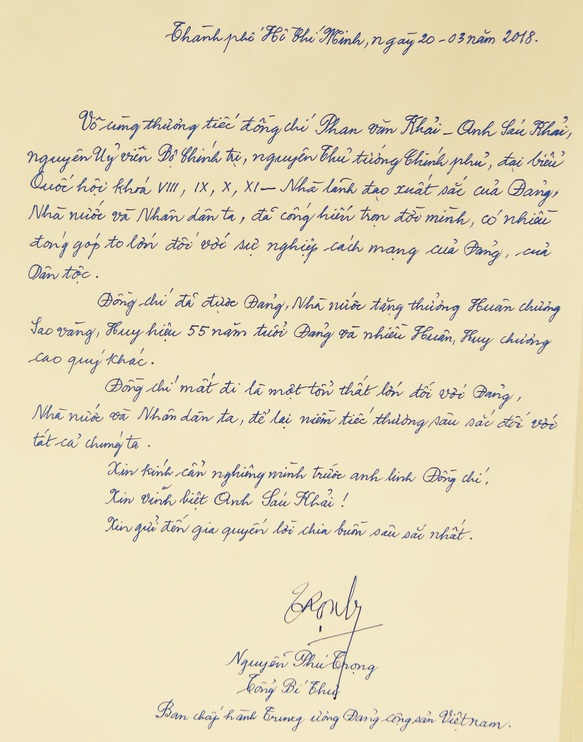 Ghi sổ tang, Tổng Bí thư Nguyễn Phú Trọng viết: “Vô cùng thương tiếc đồng chí Phan Văn Khải – Anh Sáu Khải, nguyên Ủy viên Bộ Chính trị, nguyên Thủ tướng Chính phủ, đại biểu Quốc hội khóa VIII, IX, X, XI – Nhà lãnh đạo xuất sắc của Đảng, Nhà nước và Nhân dân ta, đã cống hiến trọn đời mình, có nhiều đóng góp đối với sự nghiệp cách mạng của Đảng, của dân tộc.