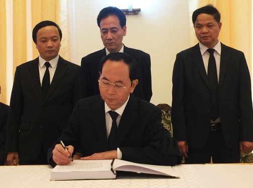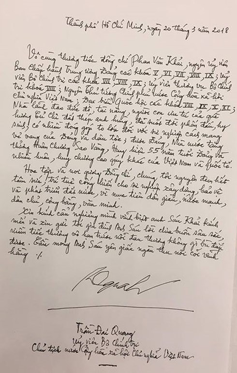 Trong sổ tang, Chủ tịch nước Trần Đại Quang viết: “Vô cùng thương tiếc đồng chí Phan Văn Khải, nguyên Ủy viên Trung ương Đảng các khóa V, VI, VII, VIII, IX; Ủy viên Bộ Chính trị các khóa VII, VIII, IX; Ủy viên thường vụ Bộ Chính trị khóa VIII; nguyên Thủ tướng Chính phủ nước Cộng hòa xã hội chủ nghĩa Việt Nam; Đại biểu Quốc hội các khóa VIII, IX, X, XI; Nhà lãnh đạo đức độ, tài năng, người con ưu tú của quê hương Củ Chi đất thép anh hùng, đã suốt đời phấn đấu, hy sinh, có nhiều đóng góp to lớn đối với sự nghiệp cách mạng vẻ vang của Đảng và dân tộc; được Đảng, Nhà nước tặng thưởng Huân chương Sao Vàng, Huy hiệu 55 năm tuổi Đảng và nhiều Huân, Huy chương cao quý khác của Việt Nam và quốc tế.