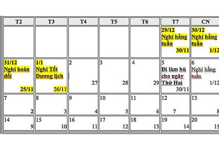Trước đó, lịch nghỉ tết Dương lịch 2018 chỉ có 3 ngày, do ngày 1/1/2018 trùng vào thứ Hai, bên cạnh đó, ngày 30/12/2017 và 31/12/2017 trùng vào thứ Bảy và Chủ nhật nên người lao động chỉ được nghỉ ba ngày liên tục.