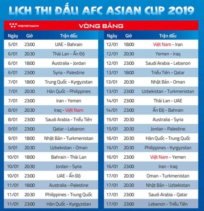 Đối với đội tuyển Việt Nam, đây là lần đầu tiên sau 10 năm chúng ta mới được dự vòng chung kết Asian Cup, nằm cùng bảng với Iraq, Iran và Yemen. Tuy không được xếp trong nhóm hạt giống hàng đầu có cơ hội giành ngôi vô địch, tuy nhiên Việt Nam được đánh giá là ẩn số thú vị, hứa hẹn sẽ gây bất ngờ.