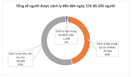 Số người cách ly: tính đến 06h sáng ngày 7/4 là 85.295 người, trong đó: Cách ly tập trung tại bệnh viện là 1.248 (chiếm 1%); cách ly tập trung tại cơ sở khác: 37.544 (chiếm 44%); cách ly tại nhà, nơi cư trú: 46.503 (chiếm 55%).