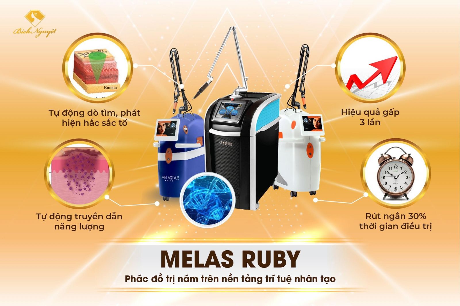 Phác đồ hình Sin chữa nám hỏng được độc quyền nghiên cứu và áp dụng tại TMV Bích Nguyệt với tên gọi Melas Ruby. Đây là sự kết hợp giữa nền tảng trí tuệ nhân tạo và tinh hoa công nghệ sinh học, đồng thời là thành quả hơn 15 năm nghiên cứu, dựa trên tình trạng da của 40.000 KH thành công của Bích Nguyệt. Phác đồ Melas Ruby sẽ được xây dựng tương thích dựa trên tình trạng của mỗi khách hàng.