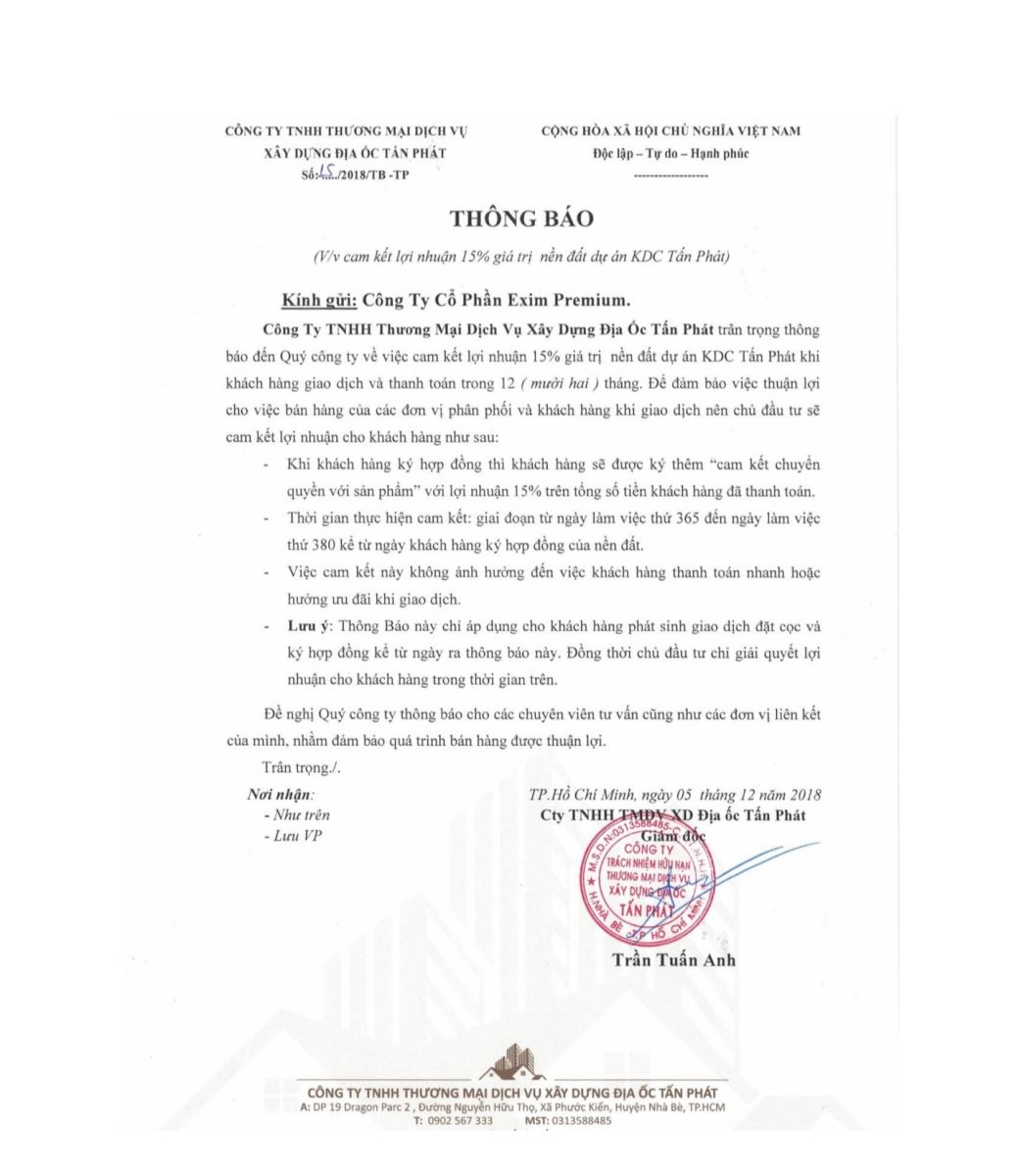 Để khách hàng vững tin khi đầu tư vào dự án, CĐT cũng thể hiện trên website: tanphatreal.vn về những giấy tờ pháp lý như: Quyết định phê duyệt 1/500 đã được thông qua; Sổ đỏ riêng từng nền.. cùng với cam kết đối với khách hàng về đảm bảo tiến độ thi công và cam kết bảo đảm lợi nhuận.