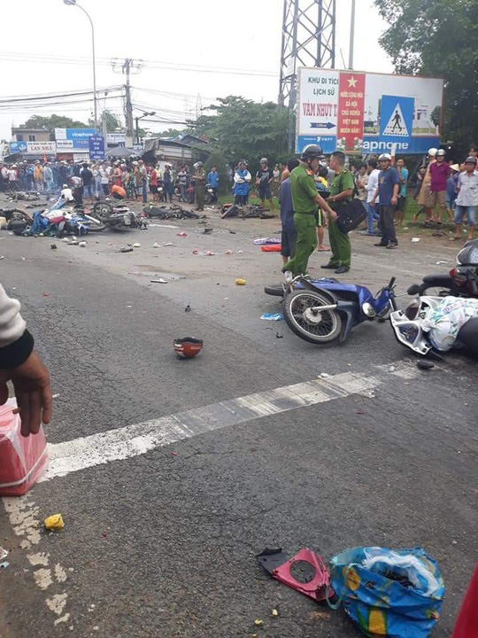 Đến 16h30, Chủ tịch huyện Bến Lức - Trần Văn Tươi cho biết, lực lượng chức năng của tỉnh đang giải quyết hiện trường. Hơn 20 xe máy bị cuốn vào gầm, biến dạng nghiêm trọng. Nhiều xe máy bị gãy đôi, nằm xếp chồng lên nhau, dầu nhớt vương vãi.