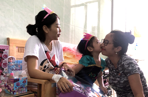 Bé Lavie thích thú vì có nhiều quà là đồ chơi và váy đẹp. Mọi người ở bệnh viện đều cảm động khi nhìn cảnh mẹ con diễn viên quấn quýt. Bé Lavie được diện hai bộ váy, một trắng, một xanh để chụp ảnh kỷ niệm với mẹ.