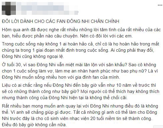 Trước những ý kiến này, ca sĩ Đông Nhi đã gửi đến người hâm mộ những dòng tâm sự chân thành và thẳng thắn nhìn nhận vấn đề đang xảy ra với chính sự nghiệp của mình cũng như đối với FC.