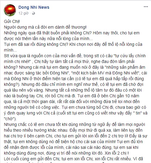 Stt vừa qua là nguồn cơn của mọi vấn đề, trong status có câu "tự cứu lấy chính mình chị nhé!". Chị hãy tự làm tất cả mọi thứ, nghe đau đớn lắm phải không? Nhưng cái mà tụi em đang muốn nói ở đây là "những sản phẩm âm nhạc được sáng tác bởi Đông Nhi", "một kịch bản MV mà Đông Nhi viết", cái mà Đông Nhi ở thời điểm hiện tại cần (có lẽ tụi em đã quá hấp tấp rồi đúng không?). Nhưng đó đâu chỉ mình em nghĩ như thế, có lẽ tụi em đã chờ đợi quá lâu nên vội vàng. Nhưng tất cả những thổ lộ tâm tư đó đâu có một lời nào là buông tay chị, rời bỏ chị mà đi. Tụi em đã ở bên chị gần 10 năm qua, là cả một thời gian dài, rất rất dài đối với những đứa trẻ loi nhoi đến những người trẻ có công việc. Tụi em chưa từng bỏ chị đi, chưa bao giờ có ý định quay lưng với chị cả.”