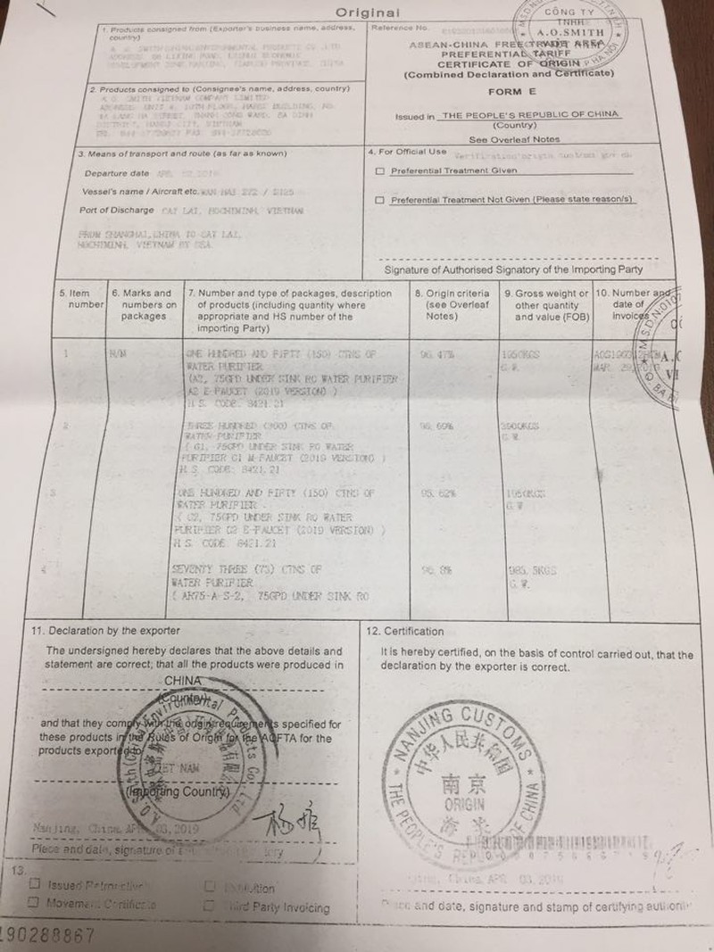 Giấy chứng nhận xuất xứ hàng hóa (CO) mẫu E mà đại diện A.O.Smith Việt Nam cung cấp đã thể hiện nhiều sản phẩm máy lọc nước đã được nhập khẩu từ Trung Quốc.