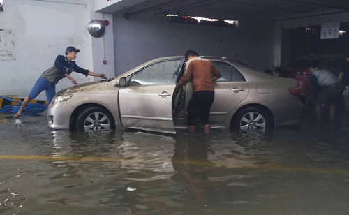 Dưới tầng hầm khu chung cư cao cấp trên đường Hàm Nghi (Thanh Khê), nơi có 10 ôtô và hơn 100 xe máy bị ngập sâu hai mét hai ngày qua, nhiều máy bơm đang hoạt động hết công suất. Hiện nước chỉ còn khoảng 30 cm, lộ ra những chiếc xe bám đầy bùn đất. Các chủ xe lục đục dắt phương tiện đi sửa.