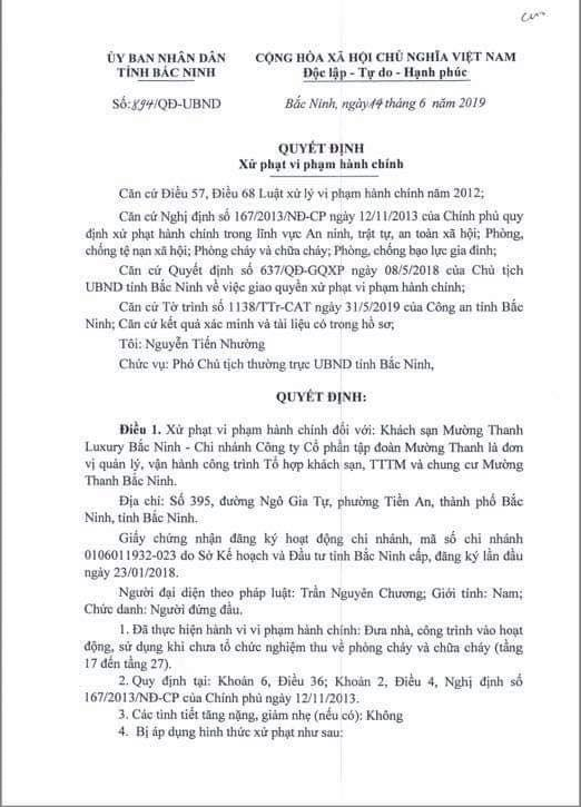 Cùng với việc xử phạt, UBND tỉnh Bắc Ninh cũng yêu cầu chi nhánh Công ty Cổ phần Tập đoàn Mường Thanh phải tổ chức nghiệm thu về phòng cháy, chữa cháy trước khi đưa công trình vào hoạt động trở lại (từ tầng 17 đến tầng 27).