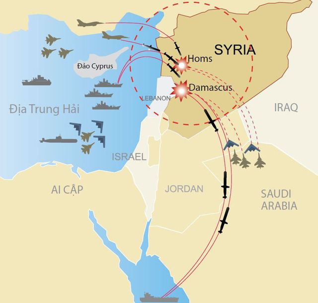 Phía quân đội Nga ghi nhận một cuộc không kích lớn nhằm vào các cơ sở hạ tầng dân sự và quân sự của Syria được tiến hành bởi tàu chiến Mỹ ngoài biển Đỏ và máy bay B-1B từ vùng Al-Tanf, kết hợp cùng không quân Pháp và Anh trong thời gian từ 7h42’ đến 9h10’ GMT ngày 13/4.