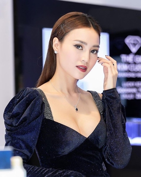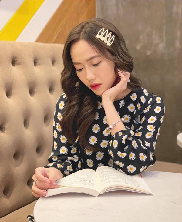 Tóc kẹp mái chẻ ngôi 5/5 hay rẽ ngôi lệch đều được sao Việt ưa chuộng. Ngọc Thảo chọn phụ kiện đính đá lấp lánh để làm điệu cho mái tóc.