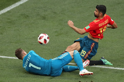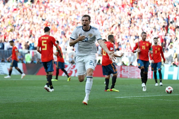 Nhưng đời không phải là mơ. Từ một tình huống phạt góc cầu âu của Nga, Gerard Pique vụng về để bóng chạm tay đồng thời biếu không cho đội chủ nhà một pha 11m. Dzyuba đã không bỏ lỡ cơ hội gỡ hòa 1-1.