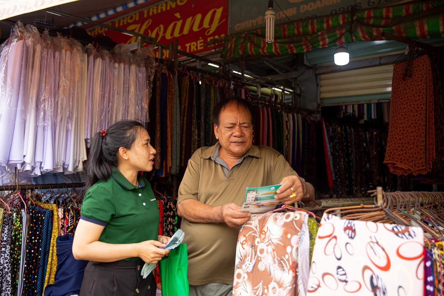 Cách chị Hoa không xa là quầy hàng của chị Lan, chuyên buôn bán quần áo. Chị chia sẻ, từ khi được nhân viên ngân hàng VPBank hỗ trợ lập tài khoản để thanh toán qua QR code, việc kinh doanh của chị dễ dàng hơn hẳn.