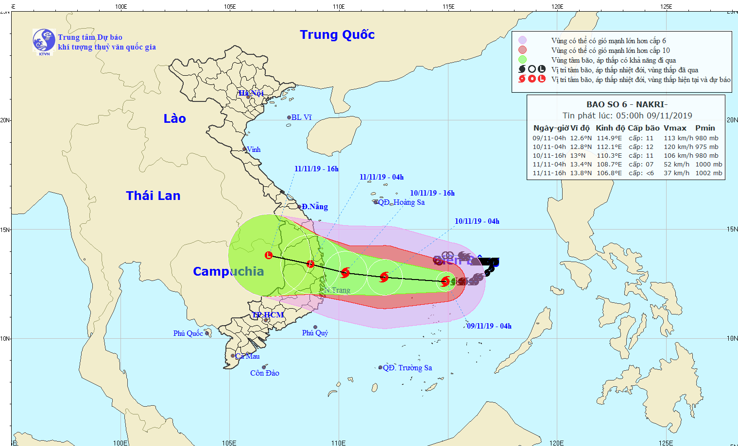 Dự báo trong 24 giờ tới, bão di chuyển chủ yếu theo hướng Tây, mỗi giờ đi được 10km và có khả năng mạnh thêm. Đến 04 giờ ngày 10/11, vị trí tâm bão ở khoảng 12,8 độ Vĩ Bắc; 112,1 độ Kinh Đông, cách bờ biển các tỉnh từ Quảng Ngãi đến Khánh Hòa khoảng 290km về phía Đông. Sức gió mạnh nhất vùng gần tâm bão mạnh cấp 12 (115-135km/giờ), giật cấp 15.