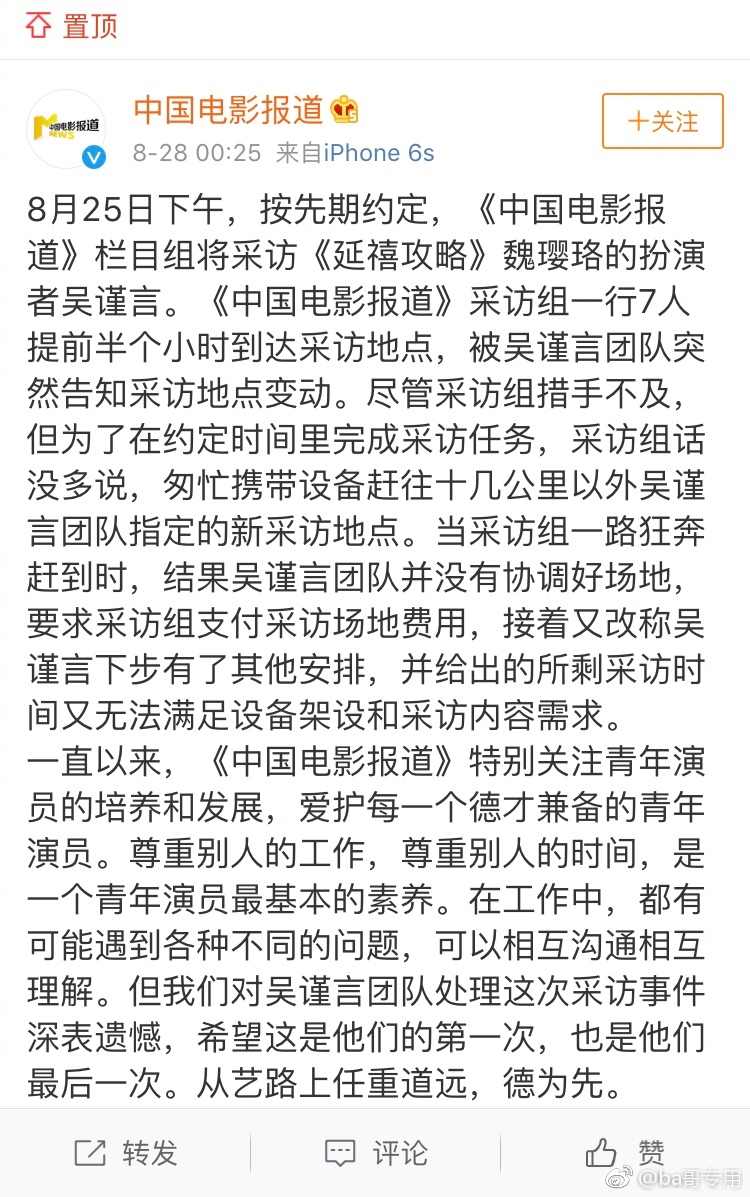Tờ Điện ảnh Trung Quốc đưa tin “Ngụy Anh Lạc” Ngô Cẩn Ngôn vừa nổi tiếng đã có thái độ làm việc bất hợp tác. Chuyên trang của đài CCTV cho biết ê-kíp có lịch phỏng vấn với Ngô Cẩn Ngôn hôm 25/8.