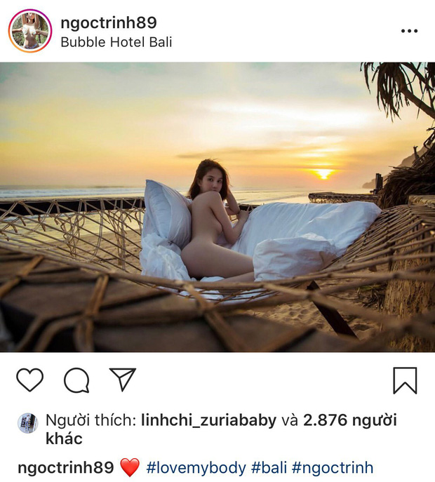 Trên trang cá nhân, người mẫu Ngọc Trinh gây chú ý khi đăng tải bức ảnh mới trong chuyến du lịch tại Bali. Trong khung cảnh biển lãng mạn, chân dài sinh năm 1989 khỏa thân, khoe làn da trắng cùng hình thể nóng bỏng. Dù đã khéo léo tạo dáng song bức ảnh vẫn nhận nhiều tranh cãi trên mạng xã hội.