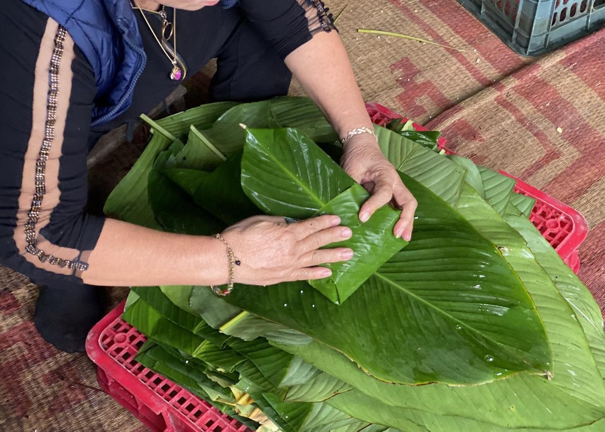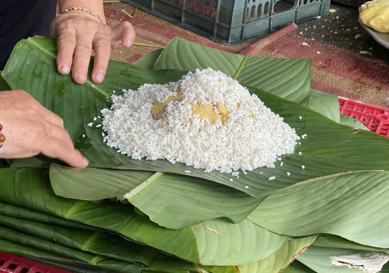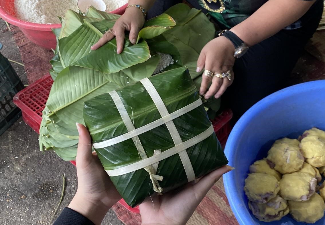 Trước khi bước vào công đoạn làm bánh, mọi nguyên liệu phải được xếp sẵn. Đỗ xanh sau khi ngâm được mang đi đồ chín, đánh nhuyễn. Thịt rửa sạch, cắt miếng cỡ vừa, trộn lẫn với hạt tiêu xay và gia vị, sau đó viên lại thành từng nắm to làm nhân bánh. Tuy nhiên, đõ xanh không được bọc kín thịt mà phải luôn để hở để khi nấu, mỡ chảy ra thấm vào lớp gạo. Lá dong tước bỏ gân cứng, gập và xếp ngay ngắn, mỗi bánh được gói gọn trong sáu chiếc lá. Nhiều gia đình cầu kỳ hơn, muốn chiếc bánh sau khi thành phẩm màu phải xanh thì có thêm một công đoạn trộn nước lá riềng vào gạo rồi gói. Cứ như vậy, mỗi người phụ trách một công đoạn riêng, người trộn gạo, người làm nhân bánh, người xếp lá.