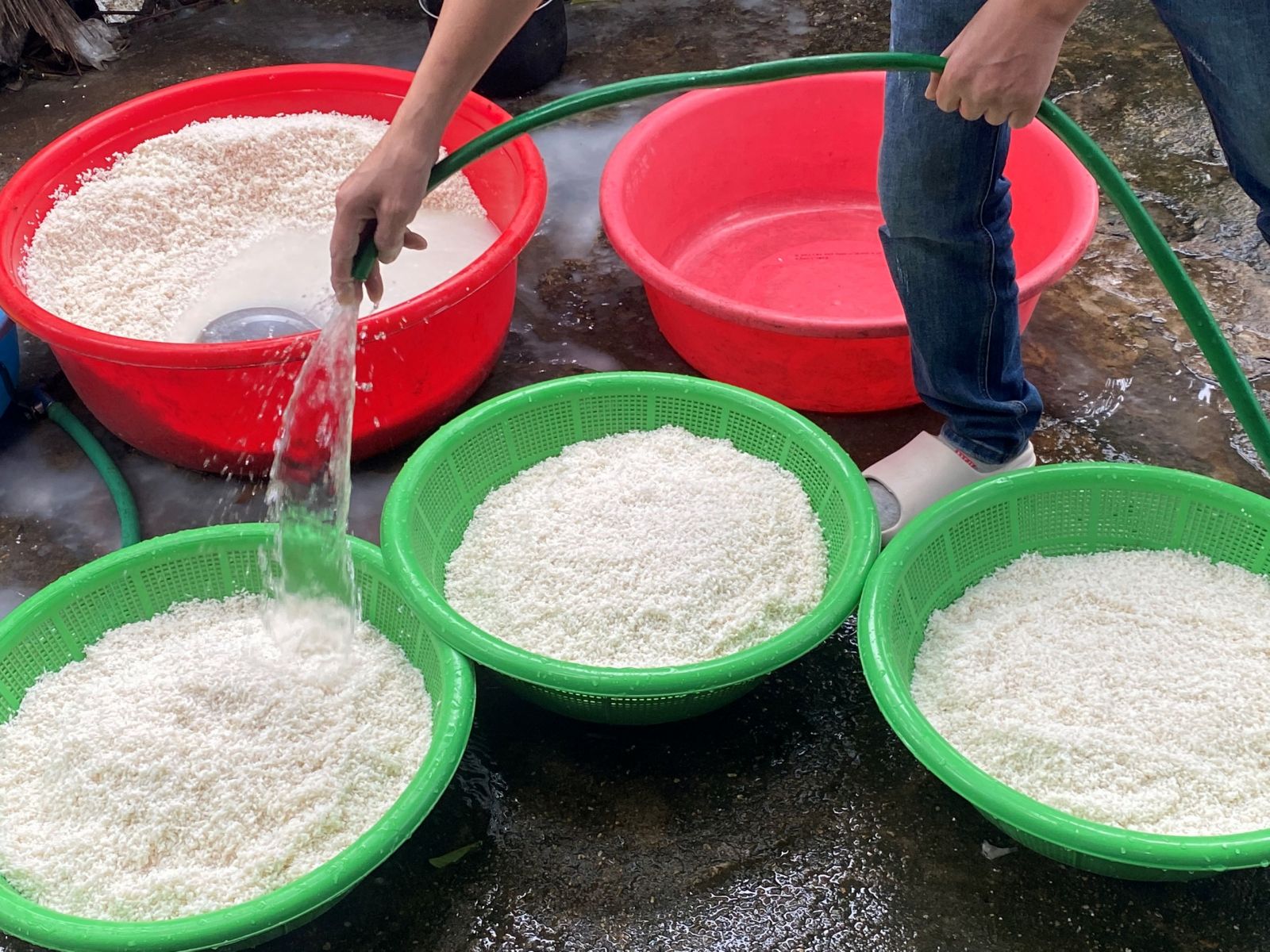 Những chiếc bánh làm ra nhanh chóng được xếp vào nồi. Công đoạn luộc bánh này giờ đây có sự giúp sức nhiều của công nghệ hiện đại nên đã bớt nhọc nhằn hơn trước. Chị Trần Linh Anh (40 tuổi) nhớ lại: “Trước đây, tất cả mọi nhà đều sử dụng bếp củi và chủ yếu là bếp than. Tuy nhiên, bếp than rất độc hại, về lâu dài ảnh hưởng không tốt tới sức khỏe nên mấy năm trở lại đây, phần lớn các hộ đều chuyển sang luộc bánh bằng bếp điện nên đỡ vất vả hơn rất nhiều”. Anh Nguyễn Văn Phong vừa làm vừa giới thiệu cho chúng tôi chiếc bếp điện mà gia đình đã đầu tư: “Bếp điện đầu tư hết nhiều tiền hơn, phải dùng điện 3 pha, nhưng không phải tốn công trông bếp nhiều như bếp than hay bếp củi, chỉ cần cài đặt giờ và chú ý pha nước luộc bánh. Nước cũng có vòi bơm trực tiếp vào nồi”. Tưởng chừng đơn giản nhưng công đoạn thêm nước vào nồi cũng có bí quyết riêng, chị Linh Anh chia sẻ, ngày xưa khi luộc bánh, các bà các mẹ hay đặt ấm nước để bên cạnh bếp, khi nào nước sôi thì đổ vào nồi, nhưng theo chị, làm như vậy bánh không được dền, nên nước khi thêm vào phải là nước lạnh.