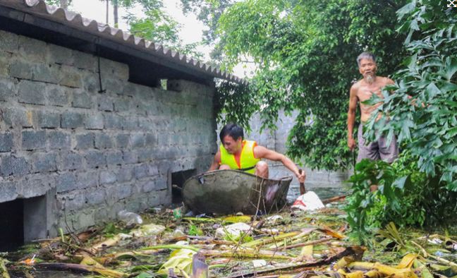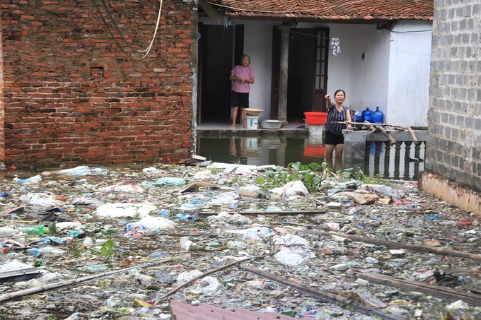 Không chỉ ngập, người dân còn đối mặt với tình trạng rác thải tứ phía. “Rác không biết từ đâu cứ dồn về nhà cả tuần nay, tôi phải lấy gậy để chặn không cho dạt vào nhà. Rác này bốc mùi hôi tanh rất khó chịu”, bà Nguyễn Thị Quyết, thôn Nam Hài (Nam Phương Tiến) nói.