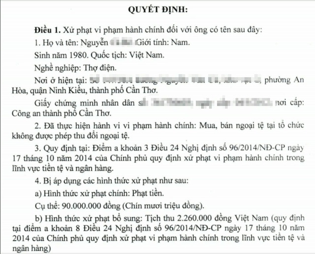 Như đã thông tin, UBND TP.Cần Thơ vừa ra quyết định xử phạt vi phạm hành chính đối với anh N.C.R (sinh năm 1980, ngụ phường An Hòa, quận Ninh Kiều, TP Cần Thơ) số tiền 90 triệu đồng về hành vi “Mua bán ngoại tệ tại tổ chức không được phép thu đổi ngoại tệ".