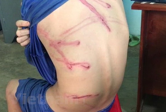 Trước đó, tài khoản Facebook “A.H.V” đăng tải hình ảnh cơ thể bé trai 12 tuổi có nhiều vết thương khắp lưng, chân, tay kèm thông tin "cha ruột lấy dây điện đánh con tại xã Long Hà".
