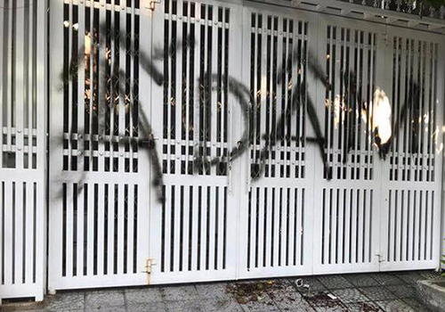 Việc dọn dẹp chất bẩn và sơn cửa đã được thực hiện ngay sau đó song dòng chữ vẫn chưa hết hẳn.