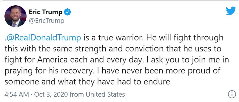 Cụ thể, Eric Trump, người con trai thứ 3 của tổng thống Mỹ, đã viết: "Donald Trump là một chiến binh thực sự. Ông ấy sẽ chiến đấu và vượt qua căn bệnh này nhờ nguồn sức mạnh mà niềm tin ông ấy mang theo mỗi ngày để cống hiến cho nước Mỹ. Tôi hy vọng các bạn sẽ cùng tôi cầu nguyện cho ông ấy mau hồi phục. Tôi chưa bao giờ cảm thấy tự hào vì một người nào đó nhờ những tổn thương họ phải trải qua như lúc này".