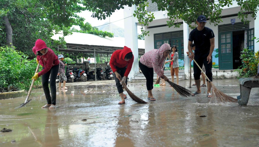 “Những ngày qua, nhà trường huy động giáo viên để dọn dẹp các phòng ốc bị ngập. Đến sáng nay, mọi người tập trung cào bùn và làm sạch sân trường để học sinh không bị ngã khi nhập học trở lại”, cô Nguyệt chia sẻ.