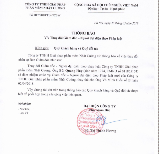 Ngoài chức vụ tại Nhật Cường Mobile, ông Bùi Quang Huy còn là người đại diện theo pháp luật và Giám đốc của Công ty TNHH Giải pháp Phần mềm Nhật Cường (Nhật Cường Software) từ ngày 2/4/2018, trước đó là ông Võ Minh Hiếu.