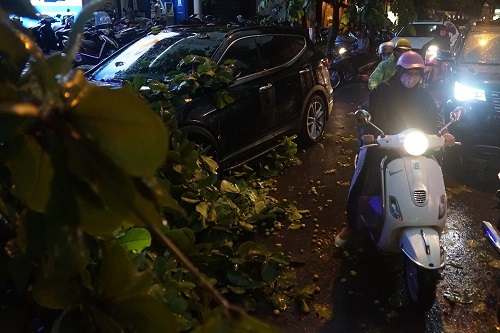 Trên phố Hoàng Quốc Việt, mưa giông khiến một cành lớn của cây bàng gãy, rơi xuống ôtô đỗ ven đường; ở phố Minh Khai có một cây hoa sữa bật gốc đổ vào người đi đường.
