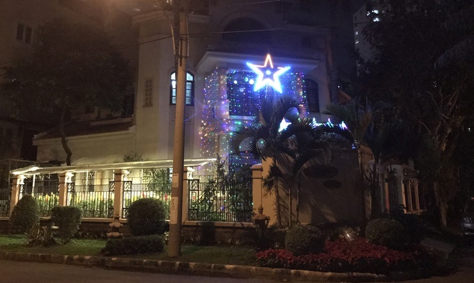 Đèn màu biến căn biệt thự nằm ở ngã ba khu Nam Thiên trở nên lung linh như lâu đài trong xứ xở nghìn lẻ một đêm.
