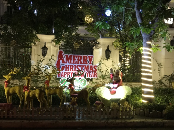 Ngoài những cây đèn màu, gia đình còn đầu tư một cụm tiểu cảnh với ông già Noel cưỡi tuần lộc.