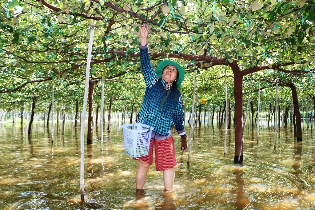 Để gấp rút khắc phục hậu quả do bão giảm thiệt hại kinh tế, người dân trên địa bàn xã, các hộ có trồng cây ăn trái đang phải bì bõm lội nước thu hoạch trái cây để bán tháo.