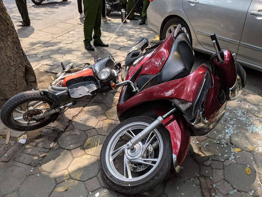 Tại hiện trường, đầu xe Toyota Corolla Altis bị hỏng nặng, một số phương tiện là xe máy, xe đạp điện dựng trên vỉa hè bị hỏng nhẹ.