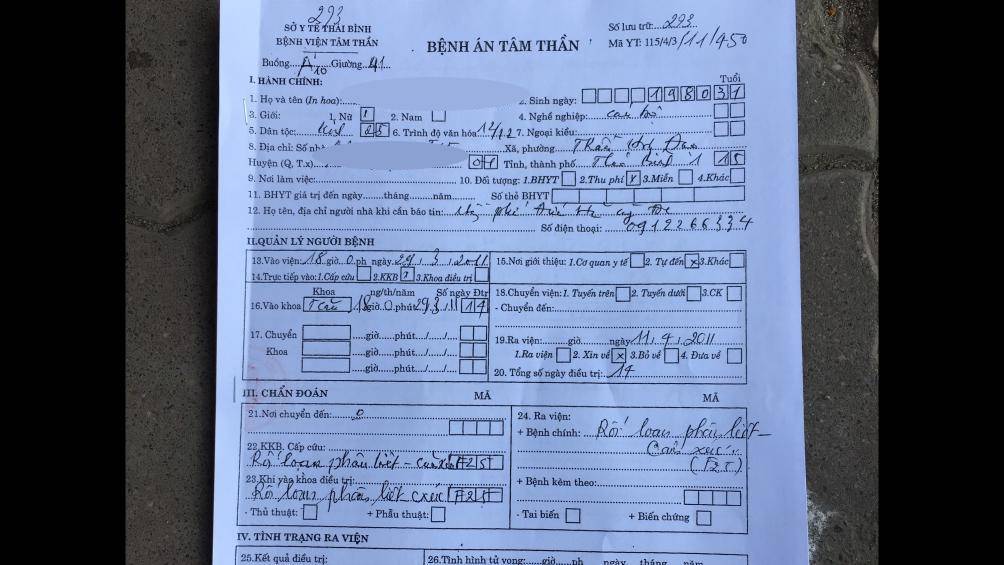 Ông Nguyễn Văn Ngọc- Giám đốc bệnh viện Tâm thần tỉnh Thái Bình cho hay, bệnh nhân L. không có sổ tâm thần. Theo vị giám đốc bệnh viện, chỉ có 2 loại bệnh được cấp sổ để uống thuốc duy trì hàng ngày tại gia đình đó là bệnh tâm thần phân liệt và bệnh động kinh.