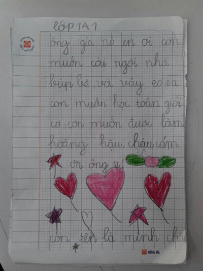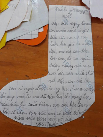 Khác với các bé khác, cô bé Hoài Anh, 7 tuổi, ở quận Tây Hồ, Hà Nội viết một bức thư khá dài gửi ông già Noel. Thư có nhiều lỗi chính tả nhưng ước mơ của bé thì rất quyết đoán. Ngoài điều ước học giỏi, viết chữ đẹp, xinh gái, cô bé còn "ước lớn lên có ngọc trai, vàng bạc, kim cương, đá quý. Mỗi khi con tiêu hết thì vàng bạc, châu báu lại xuất hiện". Bé Hoài Anh còn ước sẽ là cô tiên và có một bộ Noel năm nào mặc cũng vừa.