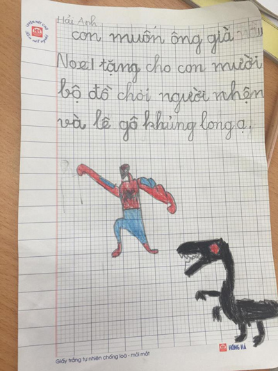 Theo đó, điều ước của bé Hải Anh cũng giống như nhiều bạn trai khác là đồ chơi xếp hình hay ôtô, không chỉ một bộ mà tới cả mười bộ để chơi "tẹt ga". Cậu bé còn cẩn thận vẽ hình minh họa để không bị nhận nhầm quà.
