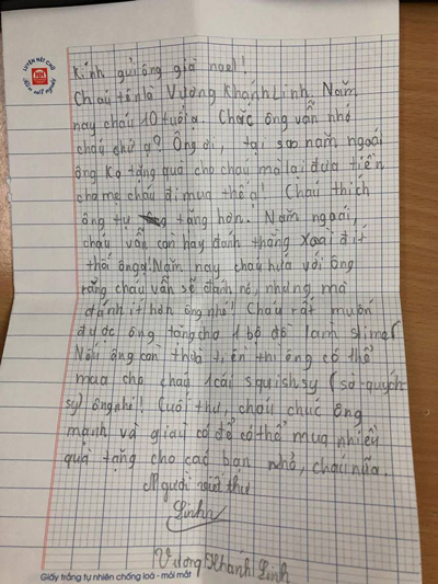 Đầu thư, cô bé "kể tội", hỏi lý do tại sao năm ngoái ông không tặng quà mà lại đưa tiền cho mẹ đi mua. Kể về thành quả một năm qua, Linh viết vẫn còn hay đánh em, năm nay hứa sẽ "vẫn đánh nó nhưng sẽ đánh ít hơn ông nhá". Cuối cùng, Linh muốn được tặng đồ chơi và không quên chúc ông "mạnh khỏe và giàu có để có tiền mua nhiều quà cho các bạn và cho cả cháu nữa".