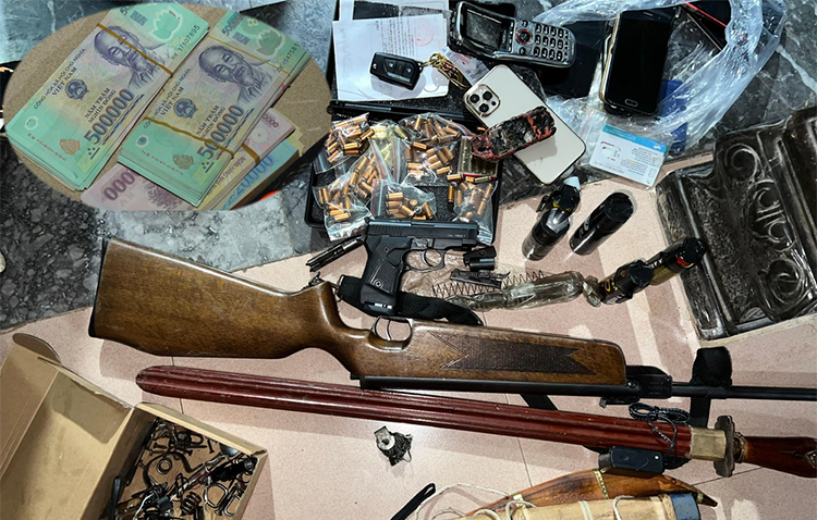 Quá trình bắt giữ, lực lượng Công an đã tạm giữ 850 triệu đồng tiền mặt, 2 cây vàng 9999, 2 ô tô, 20 xe máy, 3 laptop, 25 ĐTDĐ, 30 sổ sách dùng để ghi số lô, số đề; 1 khẩu súng bắn đạn cao su, 1 khẩu súng hơi, 3 dao kiếm, 5 bình xịt hơi cay, 1 dùi cui điện, 102 viên đạn cao su và một số tang vật khác.