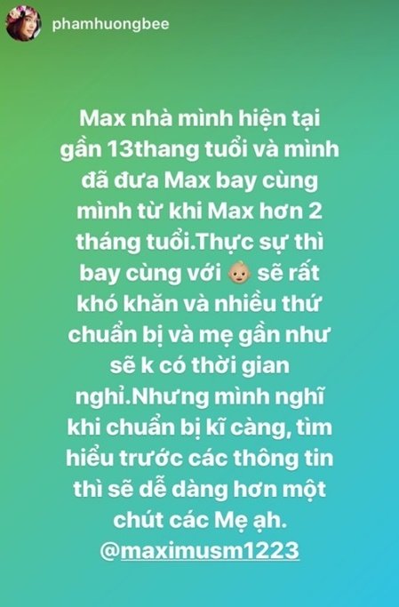 Bên cạnh đó, Phạm Hương cũng tiết lộ thêm về tình hình sức khỏe của con trai. Cậu bé hiện được 13 tháng tuổi, phát triển bình thường, thông minh và năng động. Đặc biệt chiều cao của Maximus vượt trội, đạt 99/100 tỷ lệ trẻ em cùng tuổi ở Mỹ. Nàng hậu cho rằng tương lai con trai cũng sẽ có đôi chân dài như mẹ.