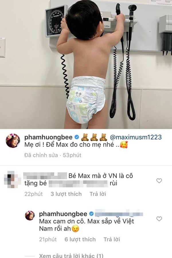 Người hâm mộ cũng hết lời khen ngợi vẻ dễ thương, bụ bẫm của nhóc tỳ. Đặc biệt, một người bạn hỏi thăm khi nào Phạm Hương đưa con trai về Việt Nam để bạn bè được gặp mặt, nàng hậu hé lộ sắp tới sẽ cùng cậu bé trở về thăm quê hương.