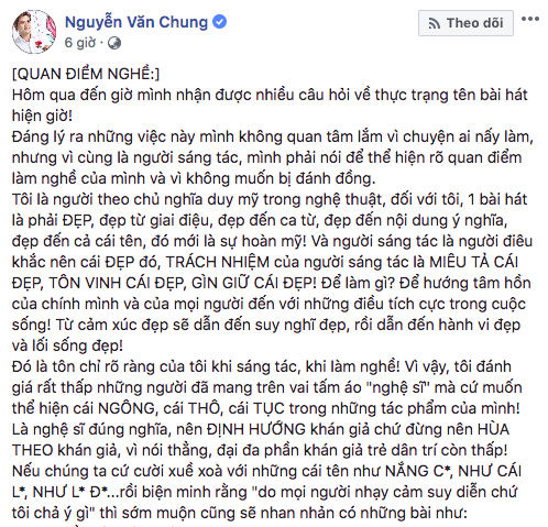 Trước đó, nhạc sĩ Nguyễn Văn Chung cũng đăng tải bức thư khá dài trên trang cá nhân để bày tỏ quan điểm trước trào lưu đặt tên bài hát để kích thích trí tò mò của khán giả trong Vpop.