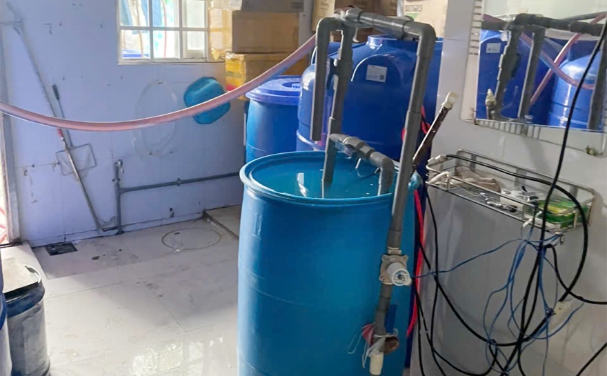 Tại thời điểm kiểm tra, trong nhà có Nguyễn Đức Minh Tâm (SN 1986, cư trú TP.Châu Đốc, tỉnh An Giang) và 2 thanh niên khác. Quá trình kiểm tra, lực lượng chức năng phát hiện trong căn nhà có chứa 472 can nhựa (loại 4 lít/can), bên trong chứa nước màu đen, có mùi nước mắm (nghi vấn là nước mắm); 4 thùng phuy chứa nước có mùi nước giặt, mỗi thùng phuy khoảng từ 500 lít - 1.000 lít (nghi vấn là nước giặt quần áo); cùng số lượng lớn can nhựa, chai nhựa, nắp nhựa, túi nhựa có chữ nước ngoài và một số công cụ, dụng cụ, nguyên liệu khác.