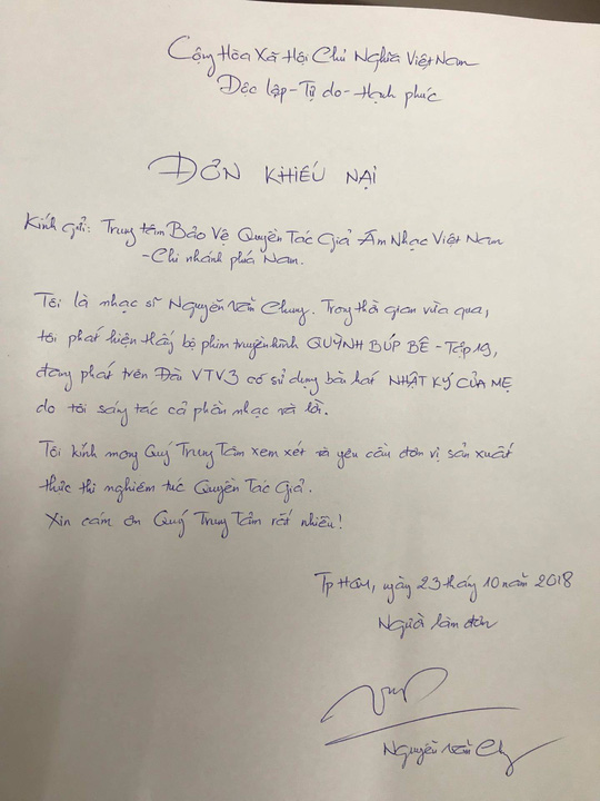 Ngày 23/10 vừa qua, nhạc sĩ Nguyễn Văn Chung đã gửi đơn khiếu nại, báo cáo vi phạm bản quyền ca khúc Nhật ký của mẹ tới Trung tâm Bảo vệ quyền tác giả âm nhạc Việt Nam (VCPMC) sau khi phát hiện bộ phim dán nhãn 18+ Quỳnh búp bê đang phát trên sóng kênh VTV3 sử dụng ca khúc này.