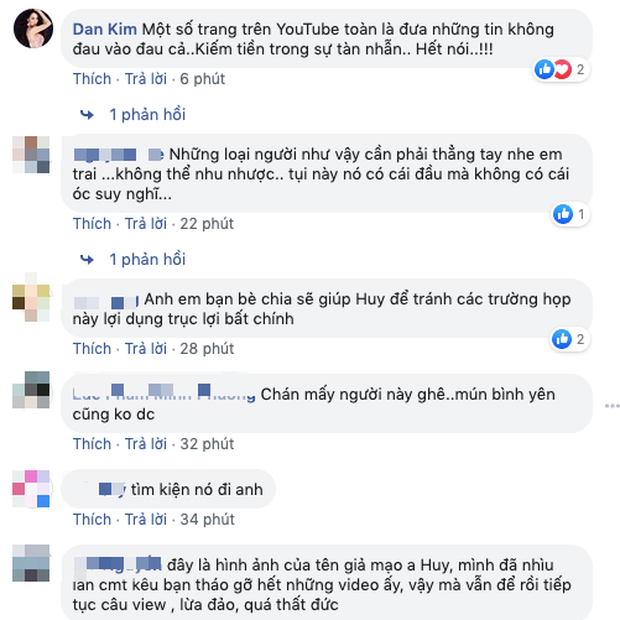 Ngoài ra cũng có đông đảo khán giả lên tiếng gay gắt về hành vi giả mạo này: “Những trường hợp như vậy cần phải thẳng tay nhé em, không thể nhu nhược”, “Anh em bạn bè chia sẻ giúp Huy để tránh trường hợp này trục lợi bất chính”, “Đây là hình ảnh giả mạo anh Huy mình đã nhiều lần bình luận kêu tháo gỡ hết các video ấy”… là những bình luận của người hâm mộ.